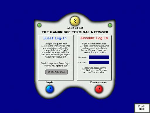 In order to understand our network architecture, it's necessary to understand what kind of services we wish to offer. When a user approaches the NetPod, he sees a heavily modified XDM (X Display Manager) which presents him with several options: Guest Login, Account Login, About and Create Account (see Figure 1). The machine costs six dollars an hour to use, paid in increments of one dollar for ten minutes. Users insert bills into a bill validator on the side of the NetPod (see Figure 2).