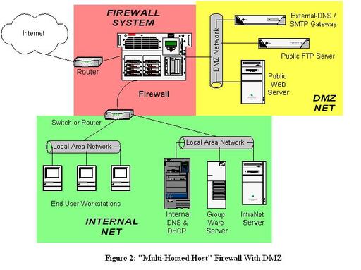 In Figure 2 we have a three-homed host as our firewall, placed so that hosts providing publicly accessible services are in their own network with a dedicated connection to the firewall, with the rest of the corporate network facing a different firewall interface. If configured properly, the firewall uses different rules in evaluating traffic from the Internet to the DMZ, from the DMZ to the Internet, from the Internet to the internal network, from the internal network to the Internet, from the DMZ to the internal network and from the internal network to the DMZ.
